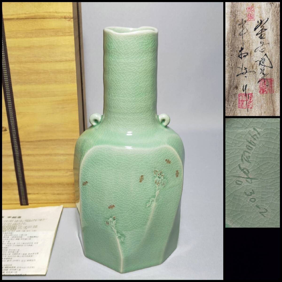 - FS27 朝鮮美術 花瓶 韓国人間文化財 松南 申相浩 高麗青磁 1990年作品 30-2 辰砂 耳付面取花入 花蝶文 高27.5cm 陶歴・共箱 茶道具 華道具