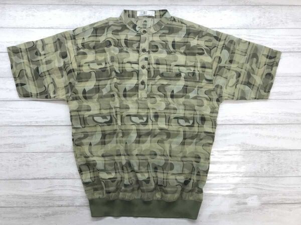 > DO IT オールド レトロ 国産古着 シースルー 幾何学 総柄 ノーカラー バンドカラー 半袖 ポロ シャツ メンズ M 緑