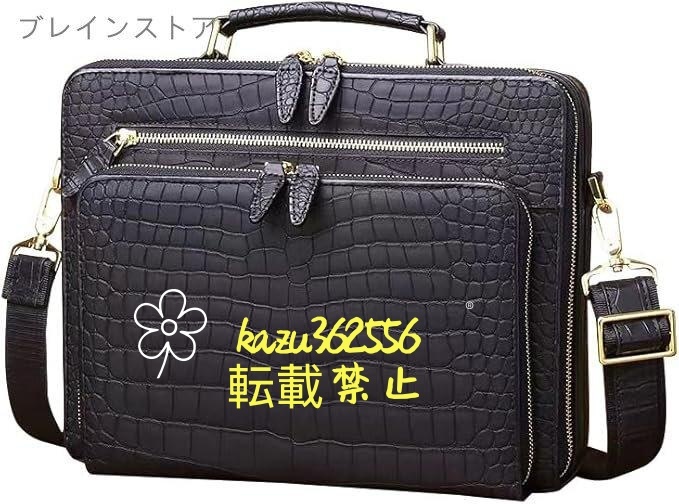 - ワニ革 本革 ビジネス バッグメンズ 2way ショルダー 手提げ バッグ クロコダイル革 ダブルファスナー 2室仕切 ブリーフケース 14インチ