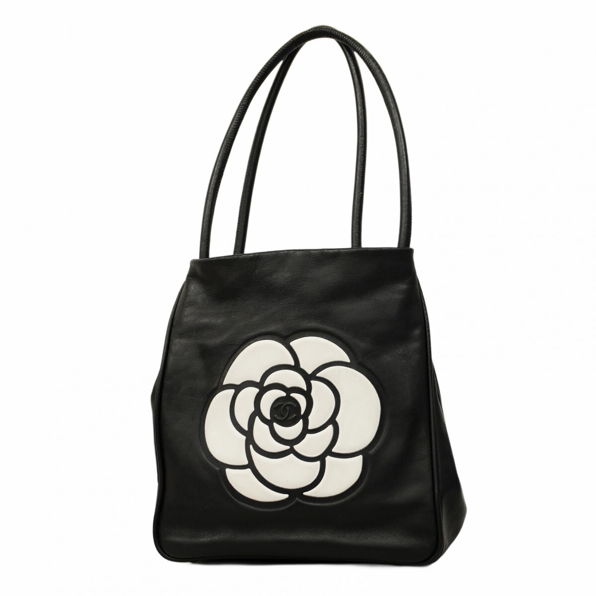 - 【5me6444-h】シャネル ショルダーバッグ カメリア レザー ブラック シャンパンゴールド金具【中古】レディース