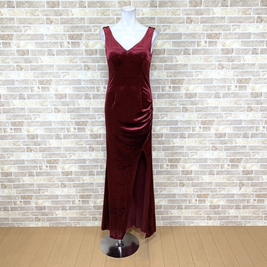 > 1円 ドレス Xiayu ロングドレス L ベロア 赤えんじ系 パーティードレス カラードレス キャバドレ 発表会 中古15965