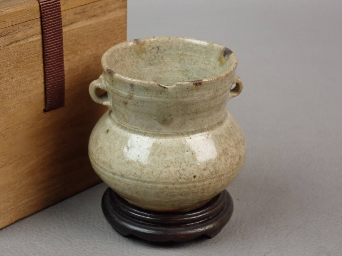 - 【骨董・茶道具】★李朝?越州窯?★★双耳小壷 gq061sgl 酒器 朝鮮美術 中国古玩 花道 華道
