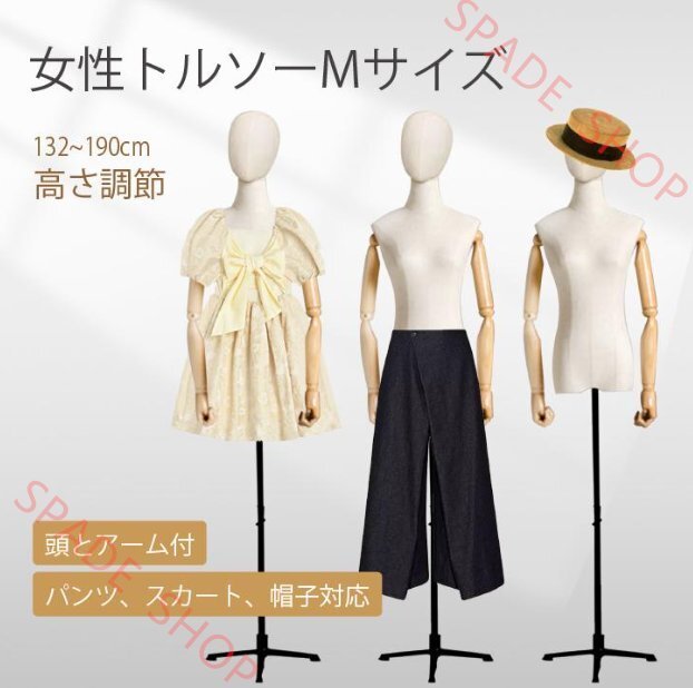 - レディーストルソー ヘッド付き 腕付き アーム付き マネキン 可動式 高さ調整可能132-190cm 衣類ディスプレイ 肩から指の関節まで動く