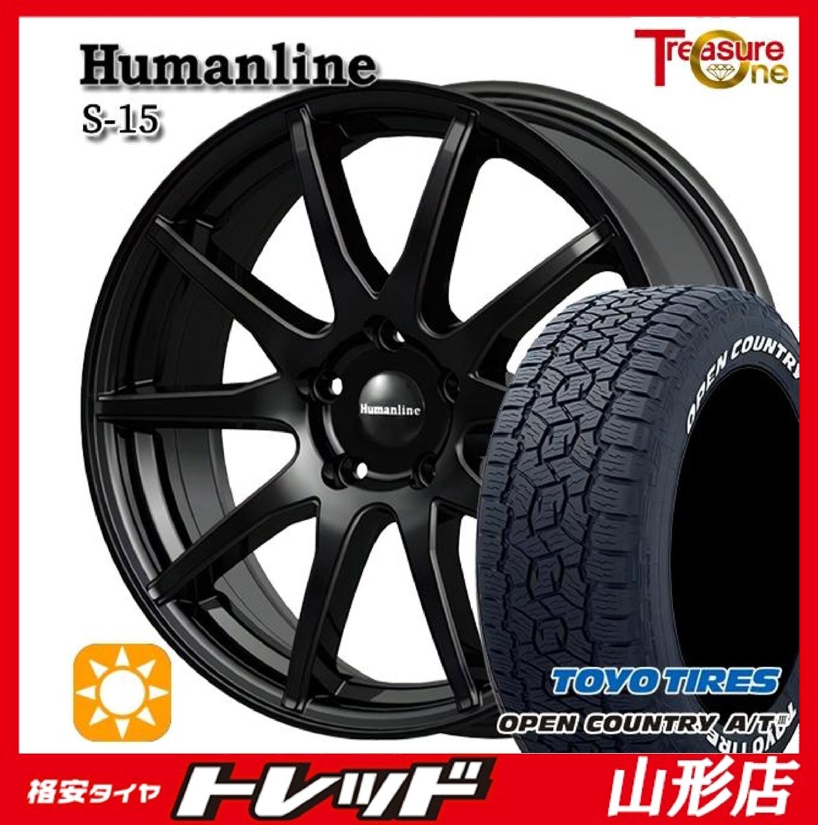 > 山形店 新品 夏タイヤホイール4本セット Humanline S-15 17インチ 7.0j 5H114.3 +48 BK TOYO オープンカントリーA/T3 225/65R17 2025年製