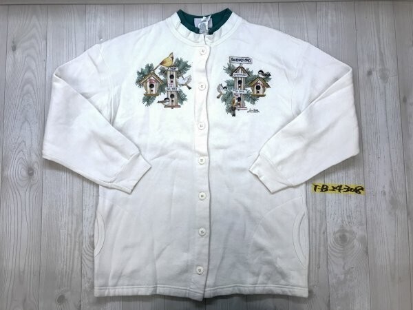 - MORNING SUN レディース USA製 鳥・小屋プリント ボタン チュニック カーディガン L アイボリーグリーン