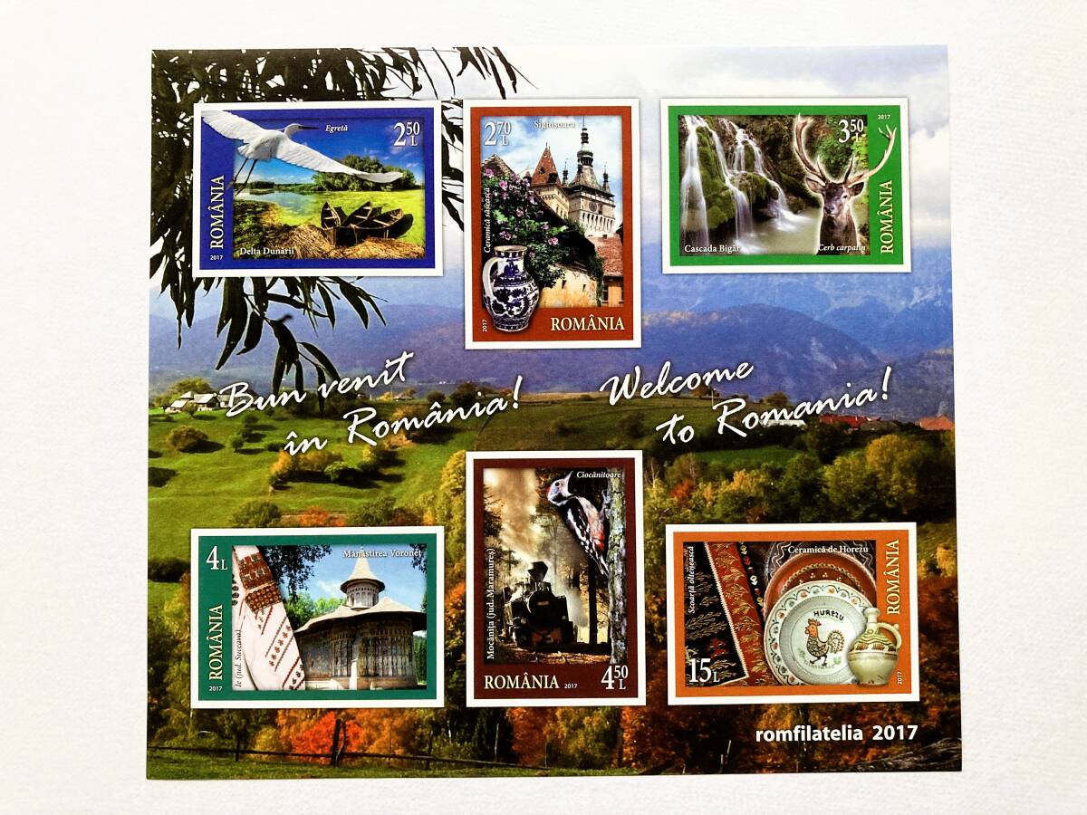 - 外国切手: ルーマニア切手 「ルーマニアへようこそ」(シギショアラ歴史地区のの時計塔 ほか) 無目打 小型シート 未使用