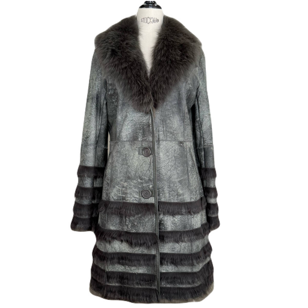 - ★ 高級 毛皮 富和 MASABARDO マッサバルド 兎革 うさぎ ラビット レザー ブルーフォックス 毛皮 コート M 美品 定価10万 緑 グレー 系