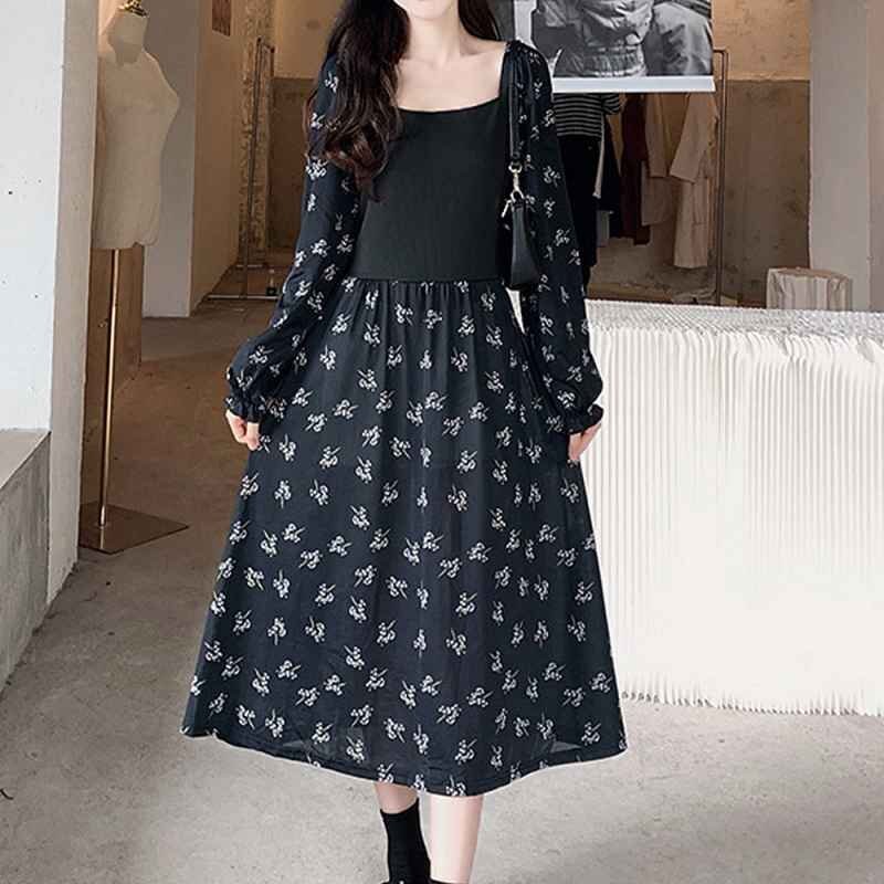 - ドッキング 花柄ワンピース レディース XL ブラック