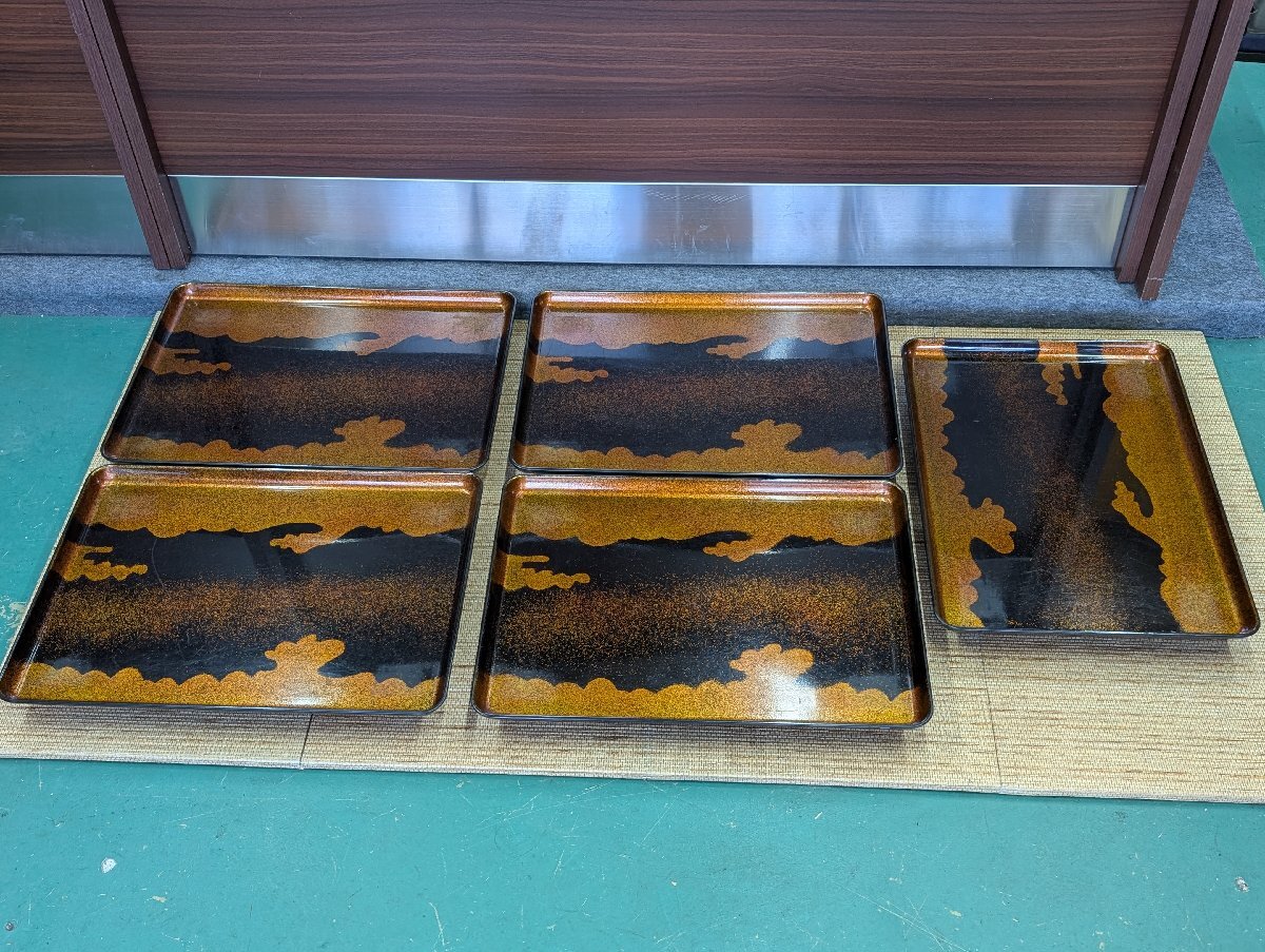 - ③中古 折りたたみ式御前 金雲 陽光膳 漆器 仕出し 会席 祝事 法事 飲食店 御膳代台 5点セット 53.5×39×H22cm