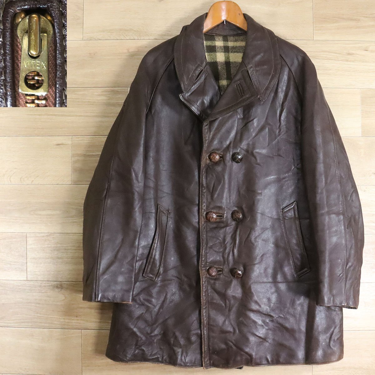 > M6S/Y4.29-6 ビンテージ ユーロ ダブルブレスト レザーカーコート 本革 レザージャケット VITEXジッパー フレンチ ヴィンテージ