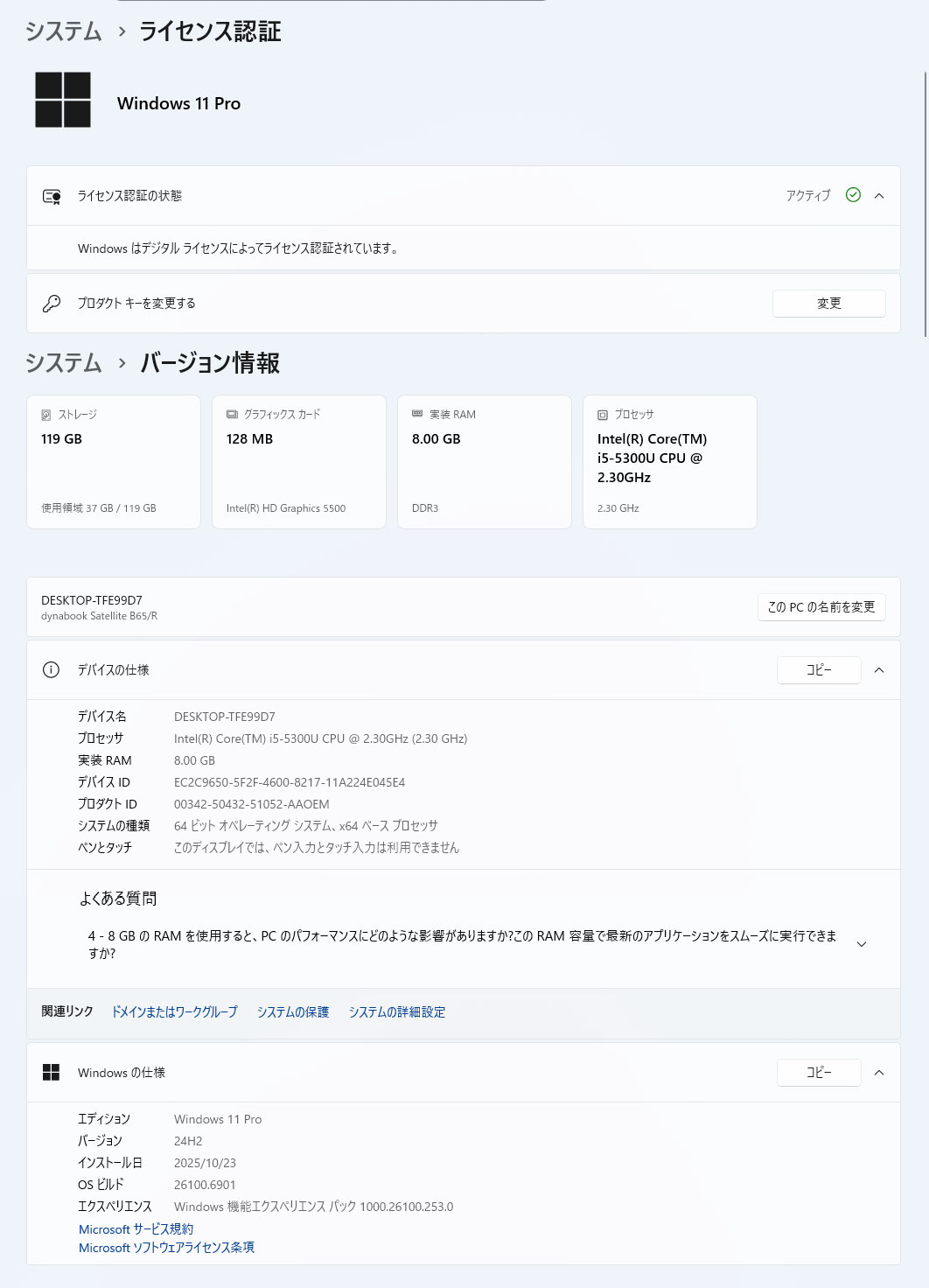 - 送料無料【中古/訳有】Office2021ProPlus入 Windows11Pro 東芝Dynabook B65/R SSD128GB Core i5-5300U 2.30GHz(2コア4スレ)/8GB/DVD-RW