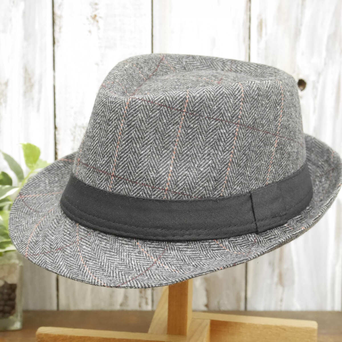 > ウール風 チェック ヘリンボーン グレー サイズ調整可 フェドラハット 中折れ 送料\450 男女兼用 ボルサリーノ パナマ