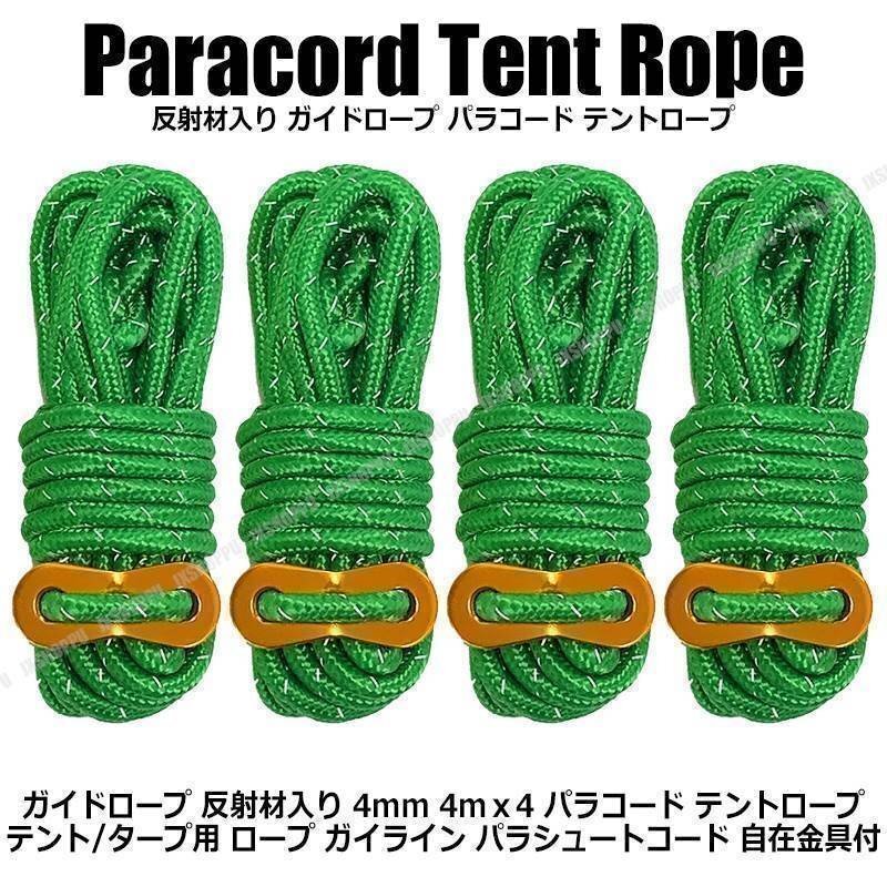- 送料0円 ガイドロープ 反射材入り [グリーン] テントロープ パラコード 4mm 4m 4本 多用途ロープ テント用 タープ用 ロープスライダー付