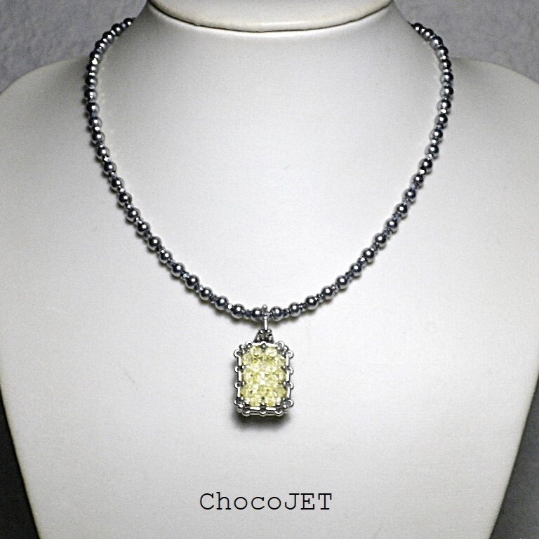 - スワロフスキープレート・スクエアネックレス クリアイエローシルバービーズネックレス 2way両面仕様黄色銀色