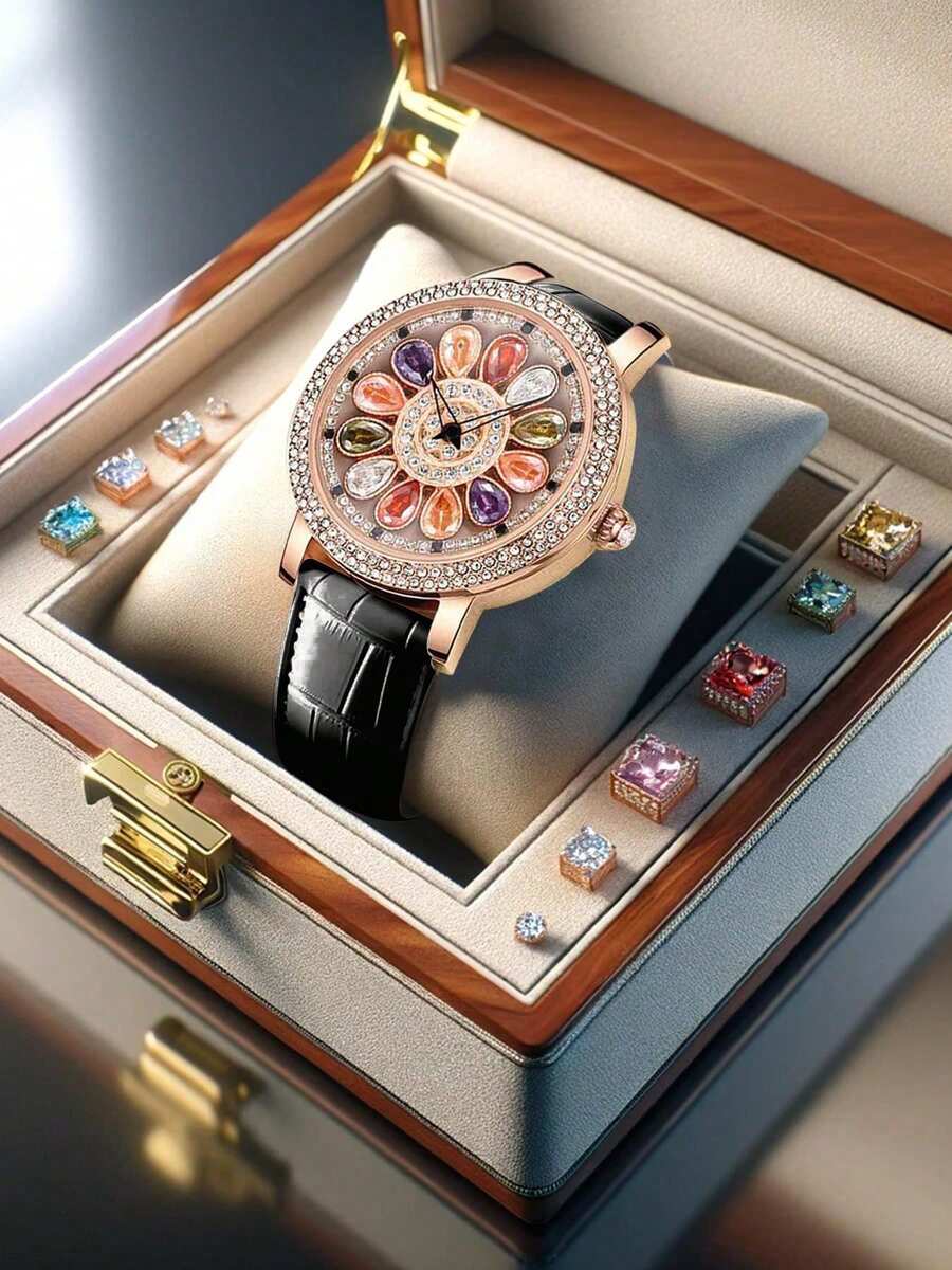 - 腕時計 レディース クォーツ 1個 レディース ローズゴールド&ホワイト エレガントな カラフル クリスタル 回転ペタル スタッズ