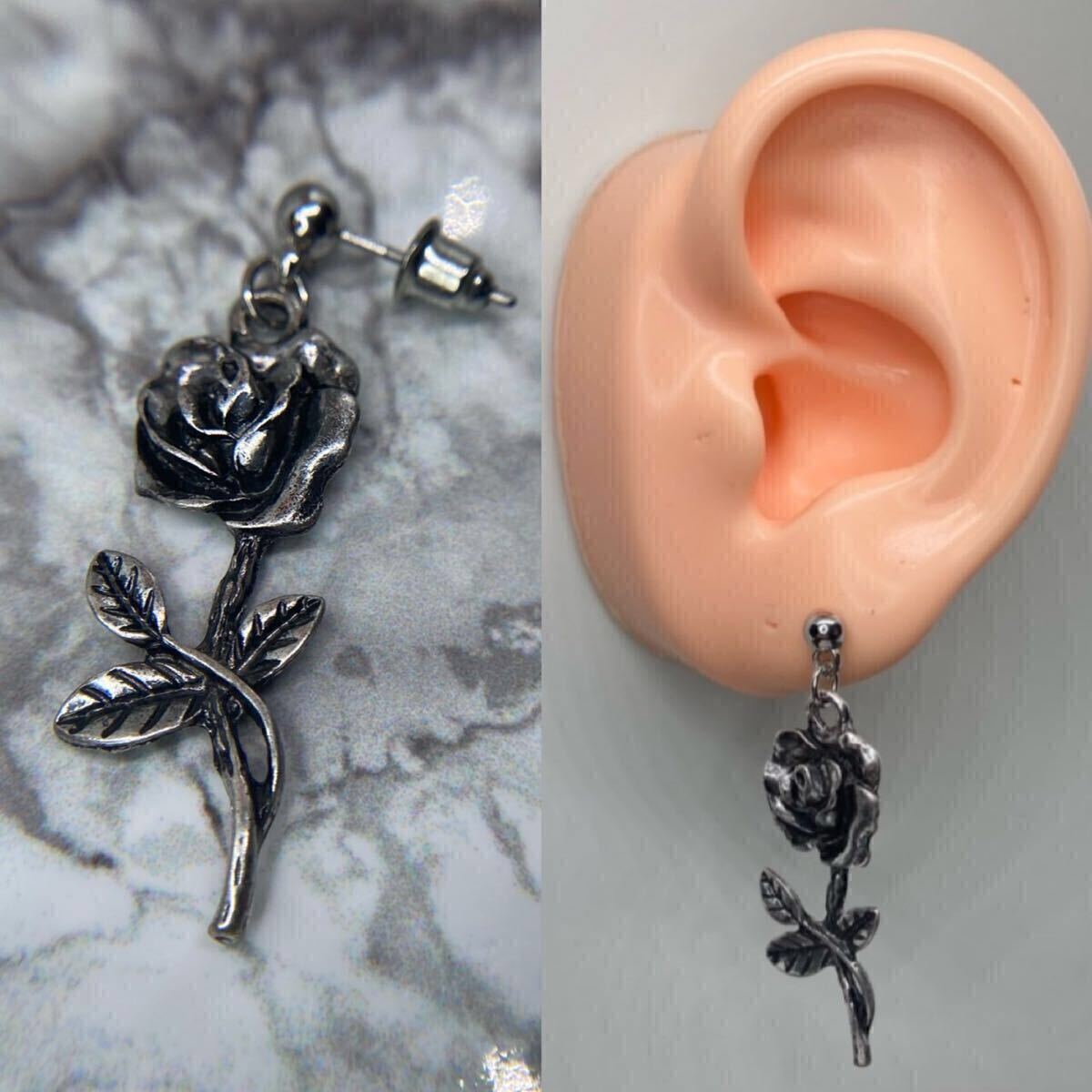 - 【新品】スタッド ピアス 18g ドロップ 薔薇 バラ ローズ シルバー ブラック 片耳 韓国