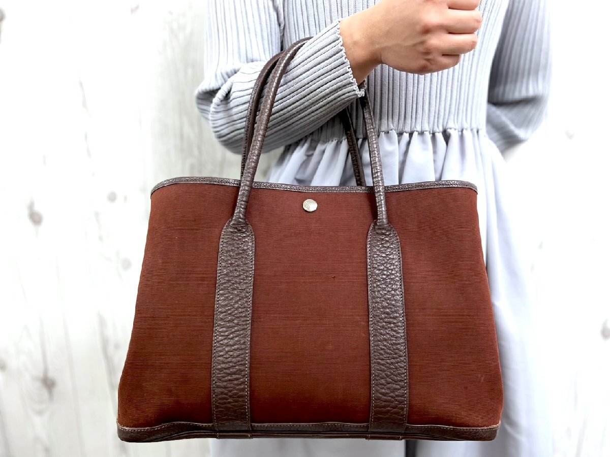 - 美品 HERMES エルメス ガーデンパーティ 36 PM トートバッグ ハンドバッグ バッグ トワルオフィシエ×レザー 茶 A4収納可 91766Y