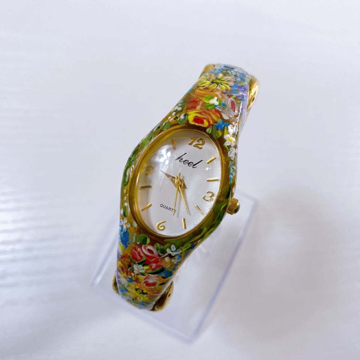 > 335【中古】heel バングルウォッチ レディース 腕時計 ラウンドフェイス クォーツ 花柄 文字盤ホワイト アンティーク 動作未確認 現状品