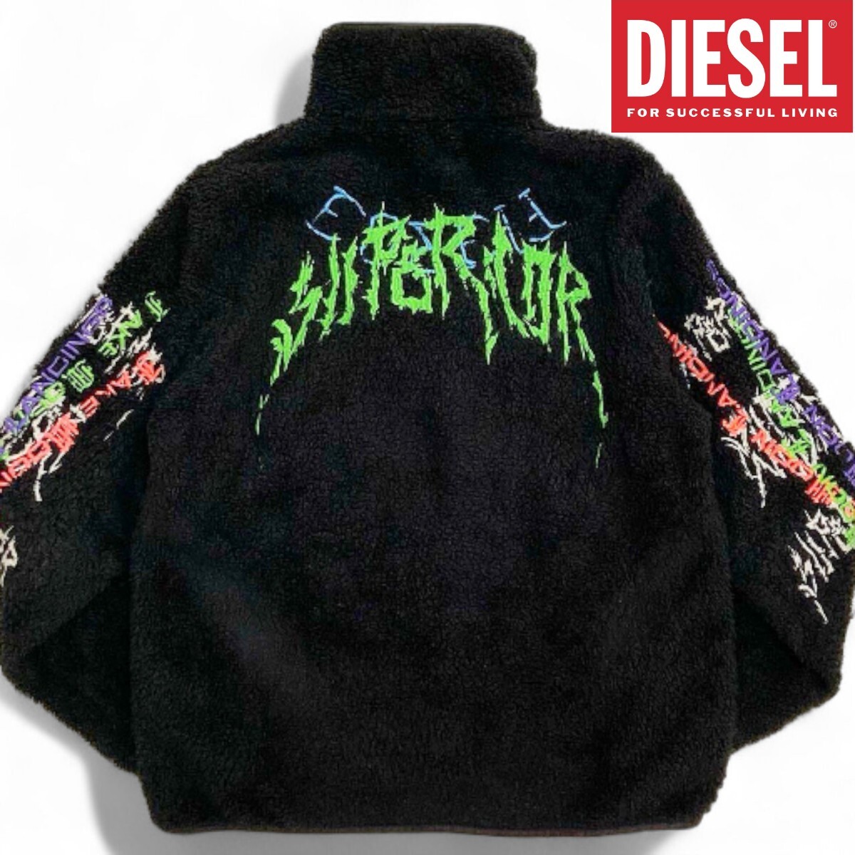 - 美品●XL相当 ディーゼル メンズ ボアジャケット ロゴ刺繍 バックロゴ ジップアップ フリース ブルゾン 極暖 DIESEL ロゴファスナー 黒