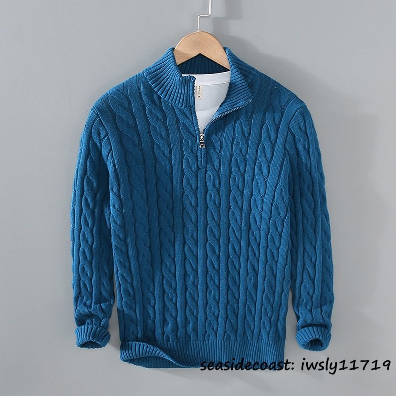 > 新品◆ニット セーター メンズ 厚手 無地 防寒 立ち襟 ブルゾン 麻編み プルオーバー ハーフジップ コットン 秋冬 上質 ダークブルー 2XL