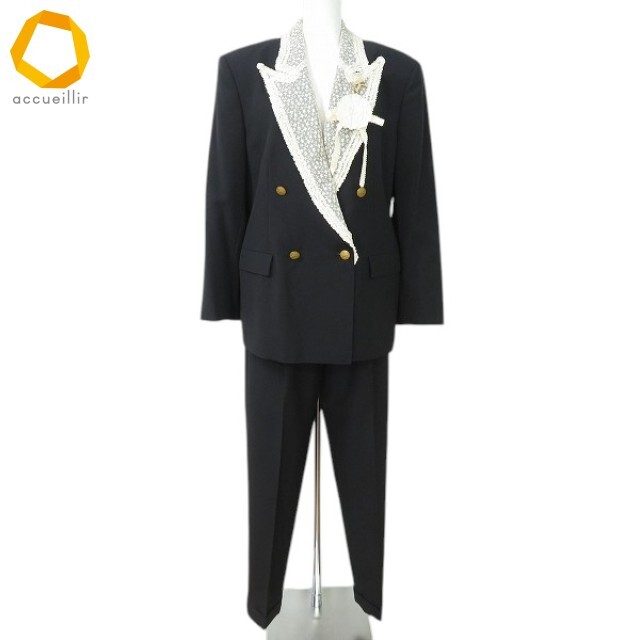 - #aux カネコイサオ KANEKO ISAO セットアップ 黒 オフホワイト レース パンツ スーツ ダブル 金釦 ブローチ付き ヴィンテージ [970954] k01