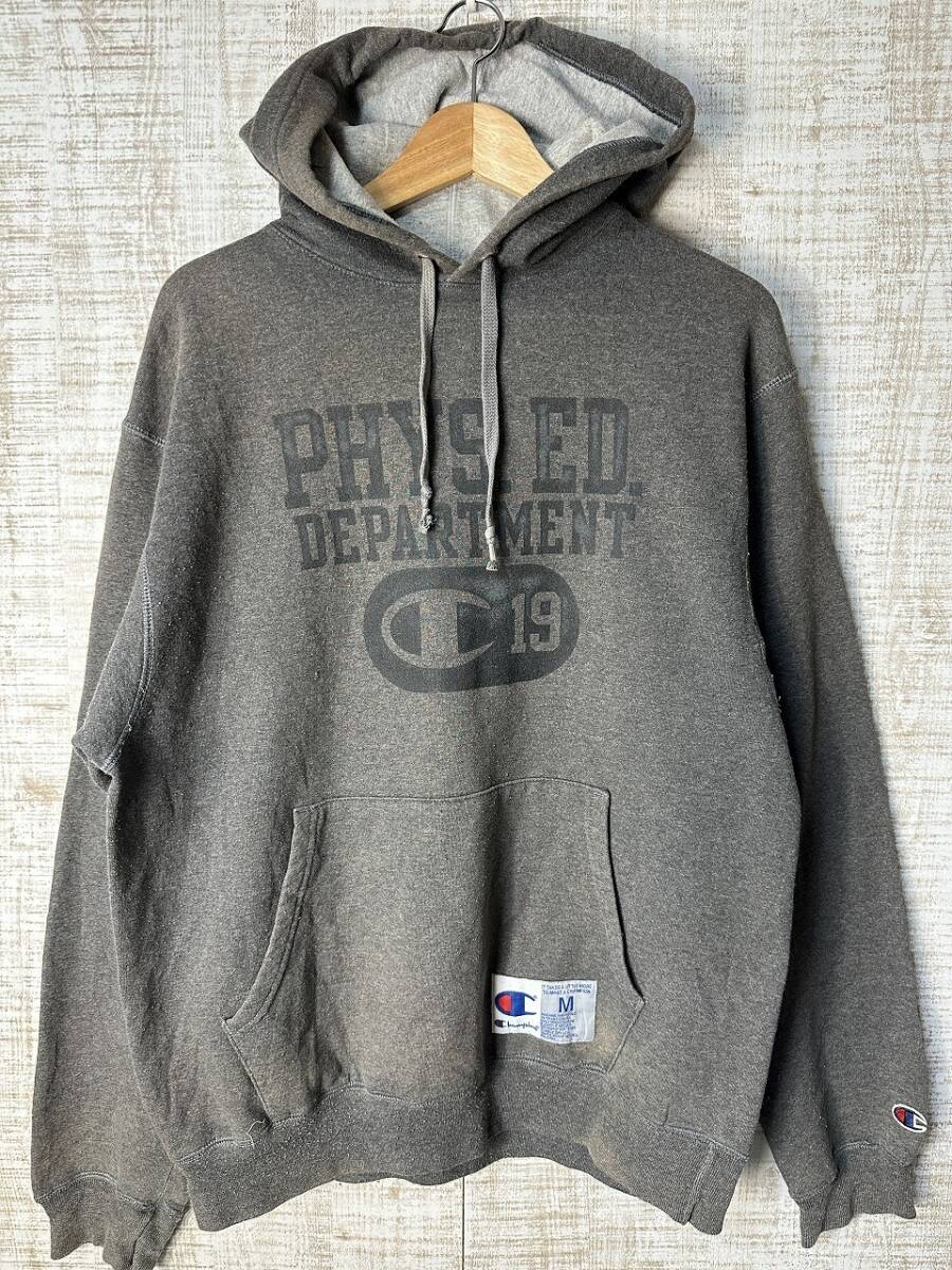 - ☆US古着 Champion チャンピオン スウェット フード パーカ プリント ロゴ刺繍 グレー裏起毛【M】 ◆5380◆