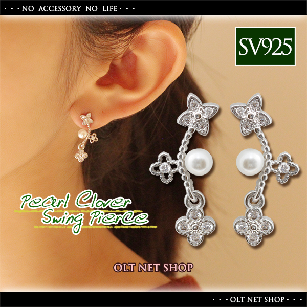 > 新品/ピアス/パール/真珠/クローバー/四葉/シルバー/レディース/両耳/揺れる/幸運/幸せ/CZ/ダイヤ/プラチナ仕上げ/銀/SV925 刻印