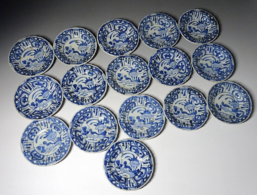 > 緑屋c■ 時代物 王地山焼 染付 小皿 16枚 古陶磁 i9/10-6616/19-3#60