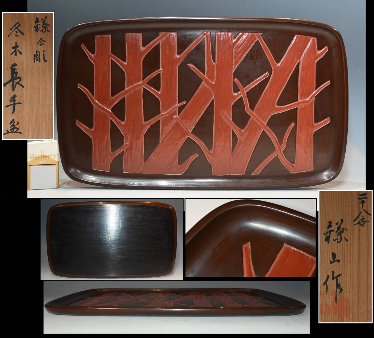 > 鎌倉彫■二十八世 三橋鎌山 作■ 冬木 長手盆 横幅約54.4cm 共箱 父は三橋鎌岳 28世 彫刻 漆器 漆芸 伝統工芸 茶道具 長形盆 四方盆 真作