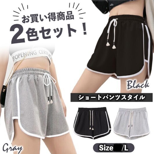 > ショートパンツ レディース ルームウェア ハーフパンツ ウエストゴム スウェット 短パン 部屋着 ラインパンツ 黒 グレー 2枚セット 0051