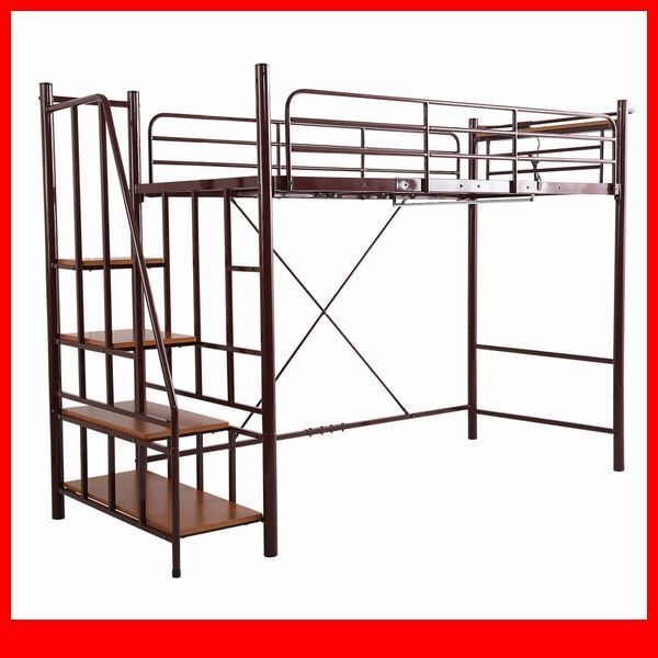 > ロフトベッド★ヴィンテージ風 高さ調整可能 階段付きロフトベッド シングル/宮棚 コンセント ハンガーパイプ/ハイ ミドル/ブラウン/a2