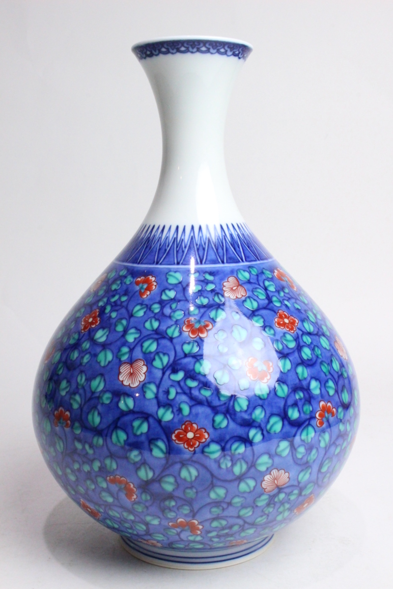 人間国宝 13代 今泉今右衛門 作 (特大:9.5号) 色鍋島吹墨草花文花瓶 [共箱・共布」