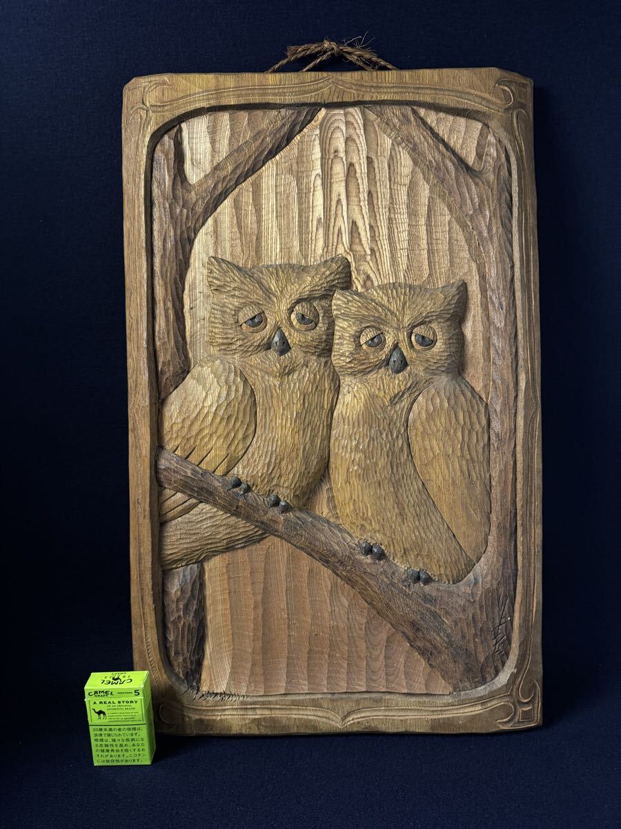 - 北海道 古い木彫り 在銘 川上哲 ミミズク フクロウ レリーフ コタンコロカムイ 梟 木兎 アイヌ 縁起物 インテリア 彫刻 置物