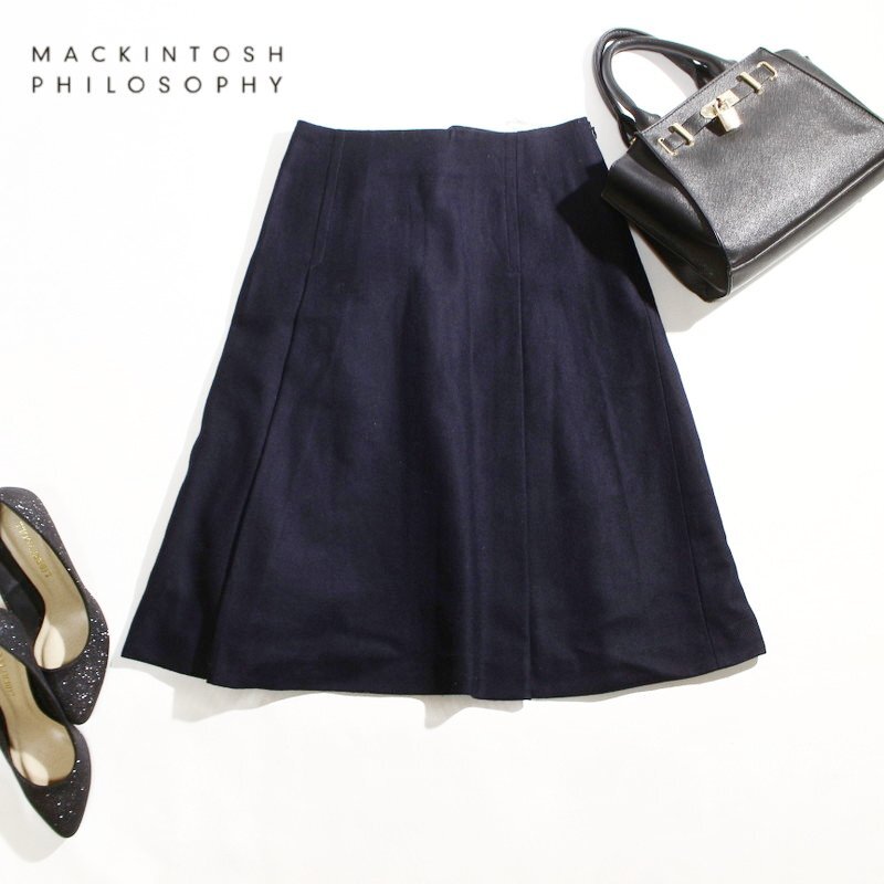 > 美品 マッキントッシュ フィロソフィー MACKINTOSH PHILOSOPHY 秋 冬 ウール フレアスカート 7号 36 ネイビー 紺 毛100% 通勤 オフィス