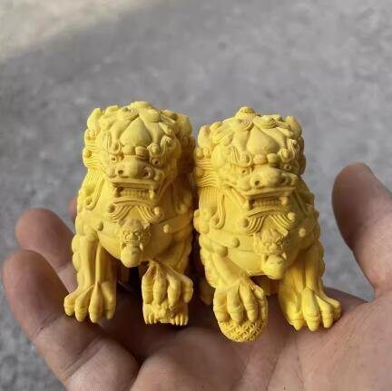 - 木彫り ツゲの木彫り 天然木 中国 ライオン 狛犬 2匹 獅子 風水 祈福 装飾品 工芸品置物 擺件 中国美術 装飾 賞物 収蔵zhzx037