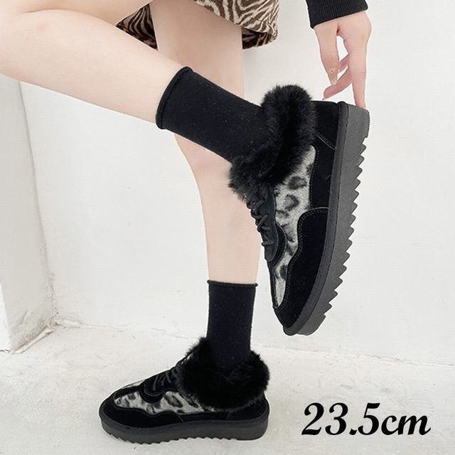 - レディース ムートンブーツ ショートブーツ 冬靴 シューズ 厚底 裏起毛 防寒 濃密毛 ボア 防寒 ローファー 豹柄 ブラック 23.5㎝
