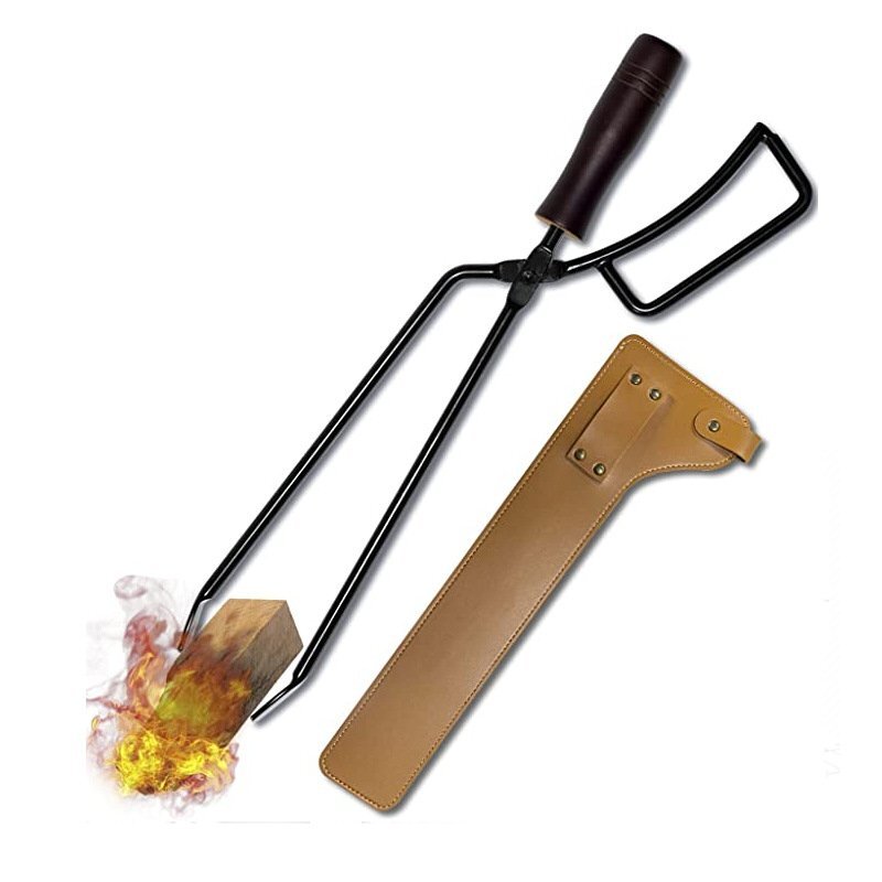 - 火バサミ 薪ばさみ ファイヤープレーストング 皮革カバー付き 木製ハンドル 超軽量 バーベキュー 焚火 アウトドア用 BBQ 520