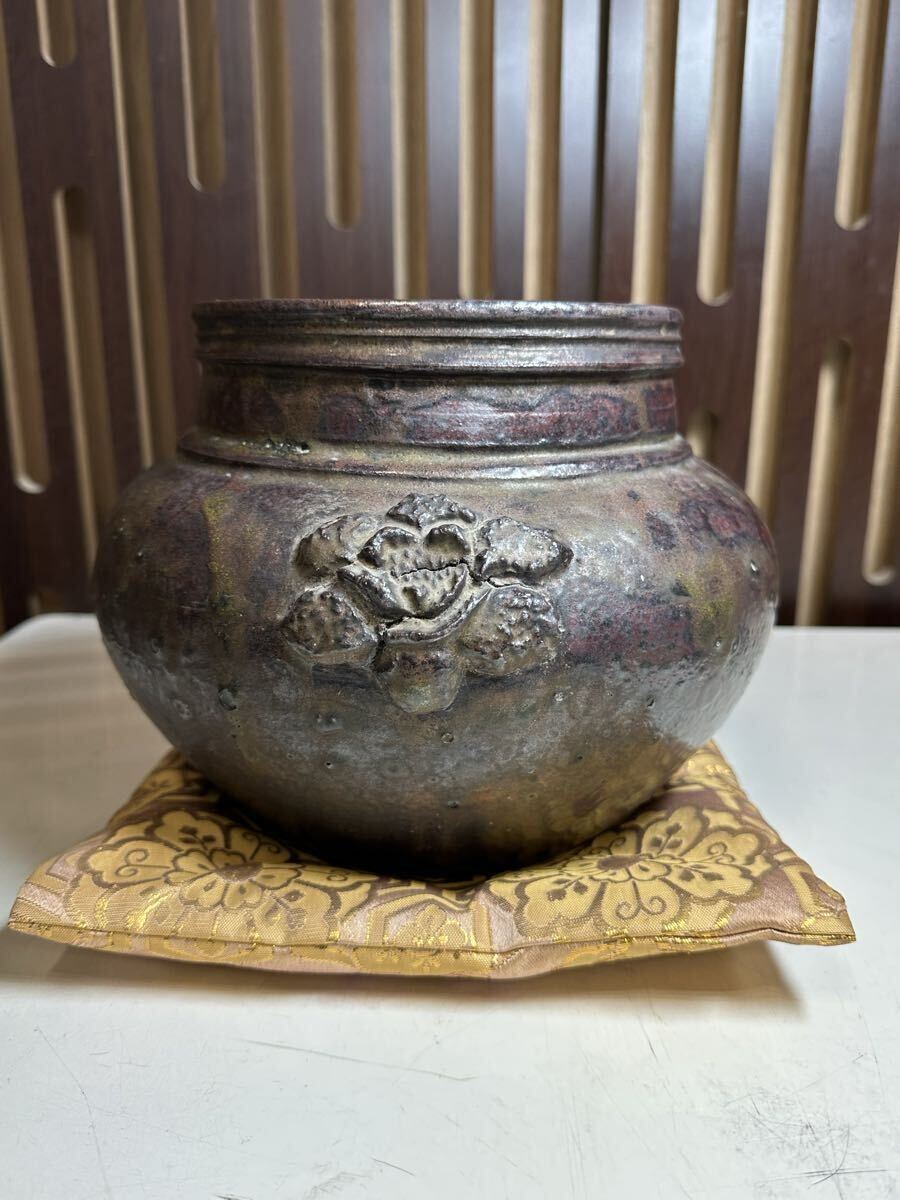 - Y11019 古薩摩 黒薩摩 苗代川焼 黒釉 玉龍山 壷 花器 座布団有 時代物