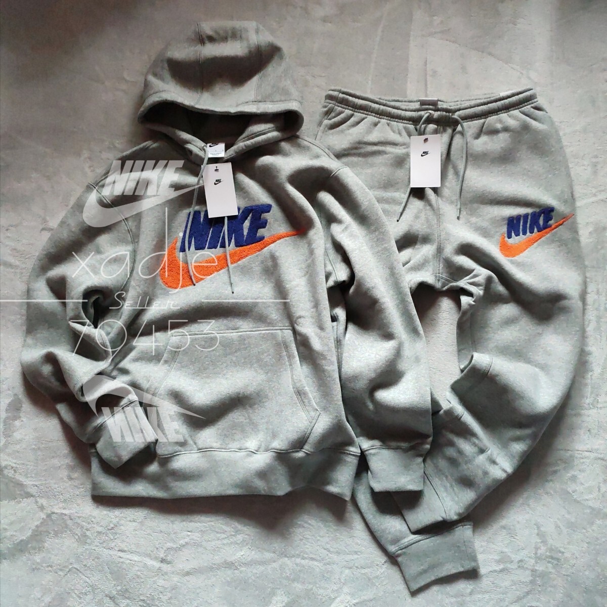 > 新品 正規品 NIKE ナイキ 立体 ロゴ 上下セット スウェット パーカー パンツ セットアップ 灰 グレー 紺 オレンジ 定価22110円 裏起毛 XL