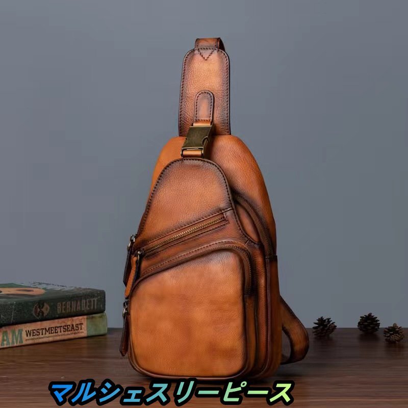 - 職人手作り 牛本革 肩掛け 斜めがけ ヌメ革 ボディバッグ ワンショルダー チェストバッグ メンズバッグ 鞄 アウトドア