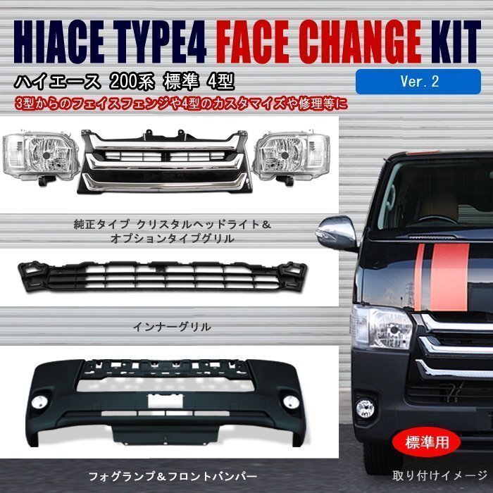 > 200系 ハイエース 4型 標準 フロント 7点 フェイス チェンジ Ver,2 ハロゲン ヘッドライト グリル バンパー セット ナロー