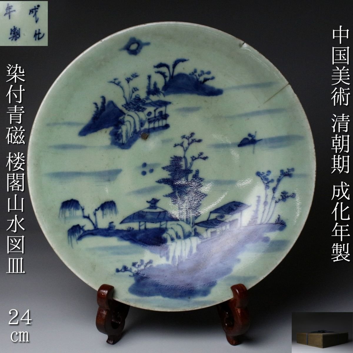 - 【LIG】中国美術 清朝期 成化年製 染付青磁 楼閣山水図皿 24㎝ 箱付 古美術品 コレクター収蔵品[.WW]25.11