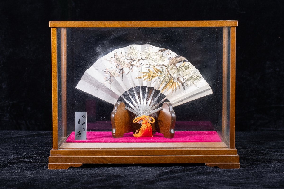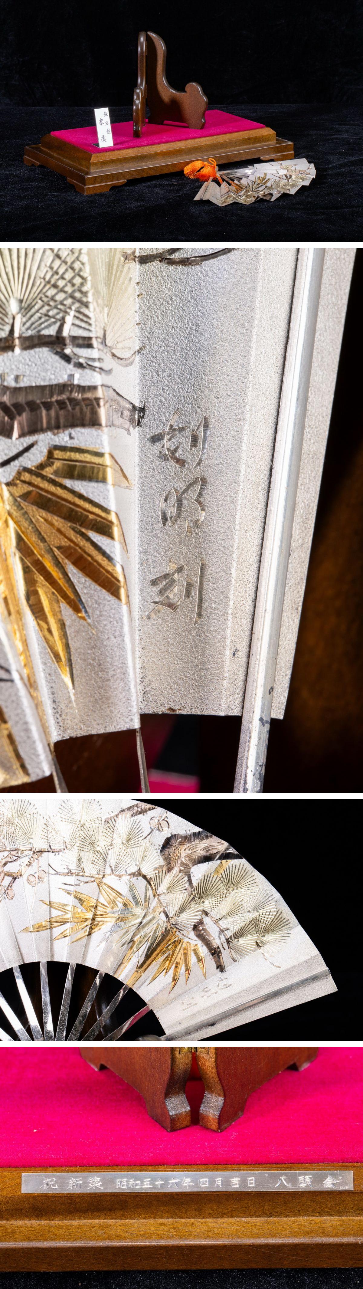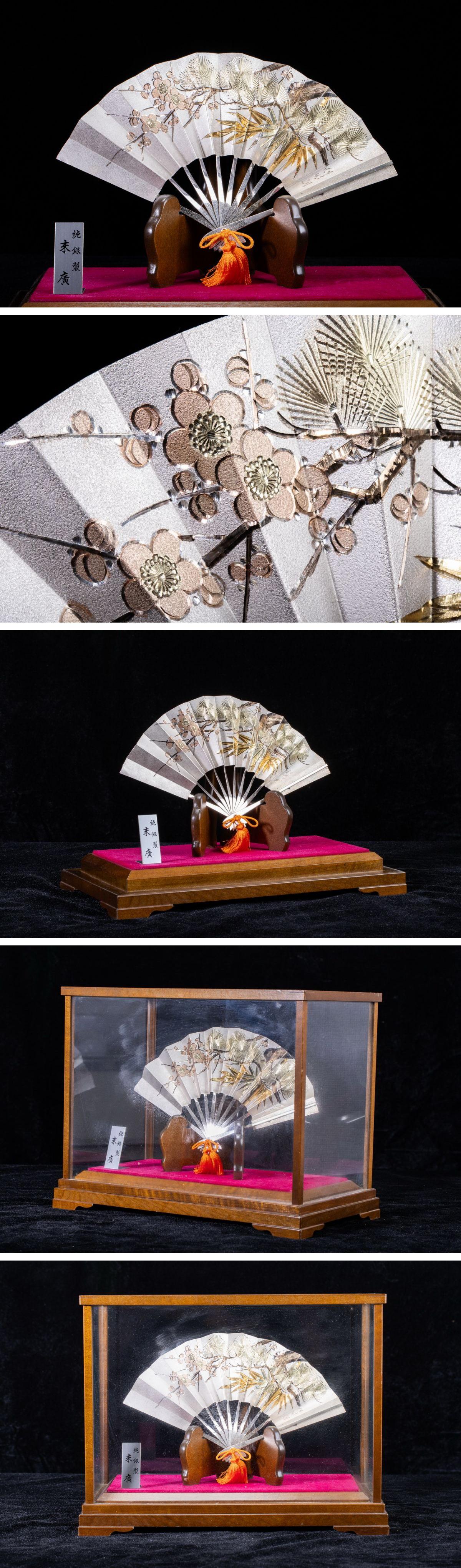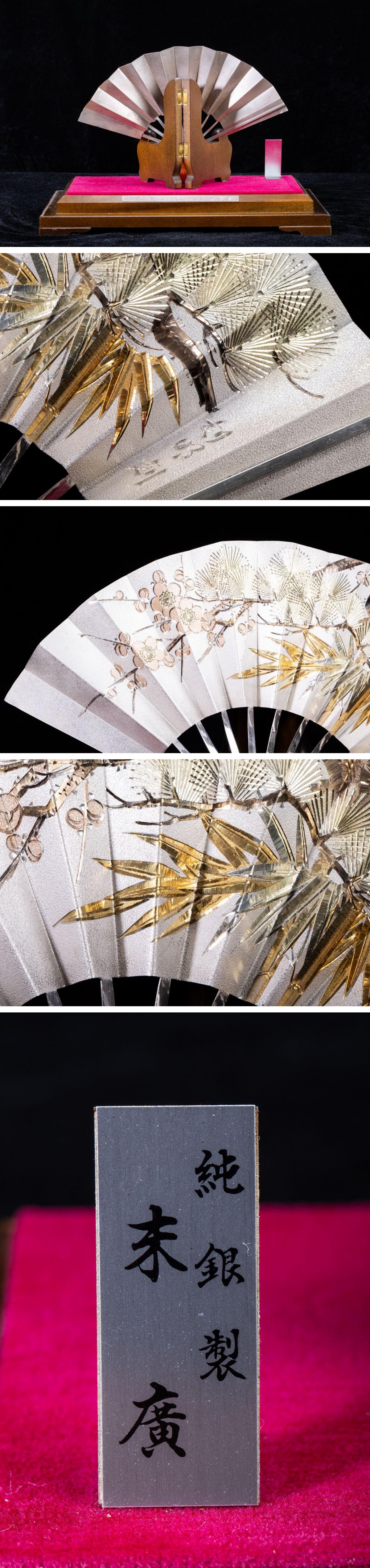 - 【珍品堂】1円から N43-V17 純銀製 松竹梅図扇子 末廣 作 在銘 金彩 刻印 重99g シルバー sliver ケース付 鑑賞品 時代物 骨董品 古美術