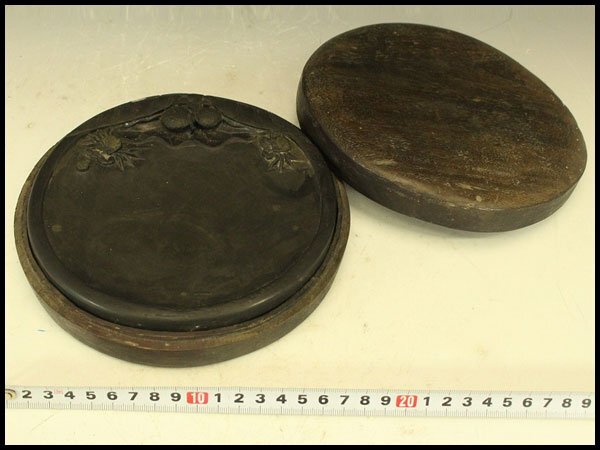 - 【銀閣】端渓 刻蟹果 円硯 φ16.5cm 文房四宝 旧家蔵出 送料無料(LC641)