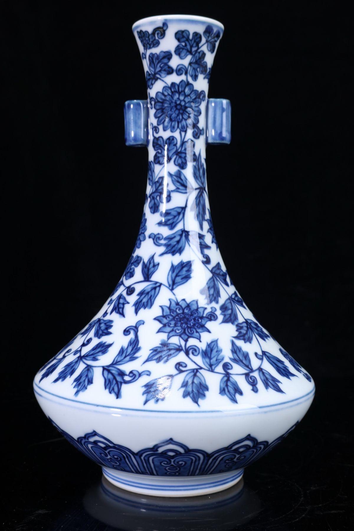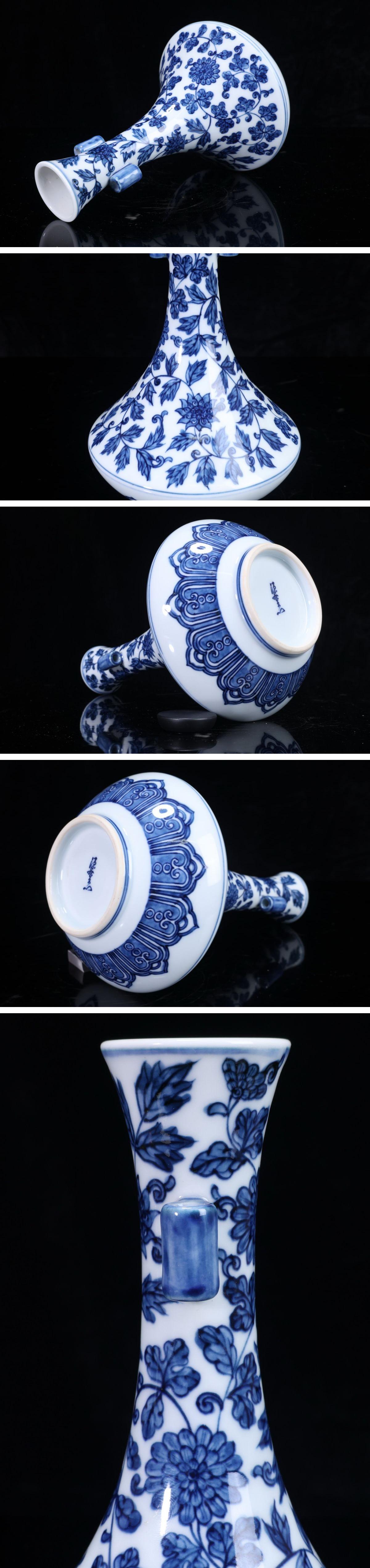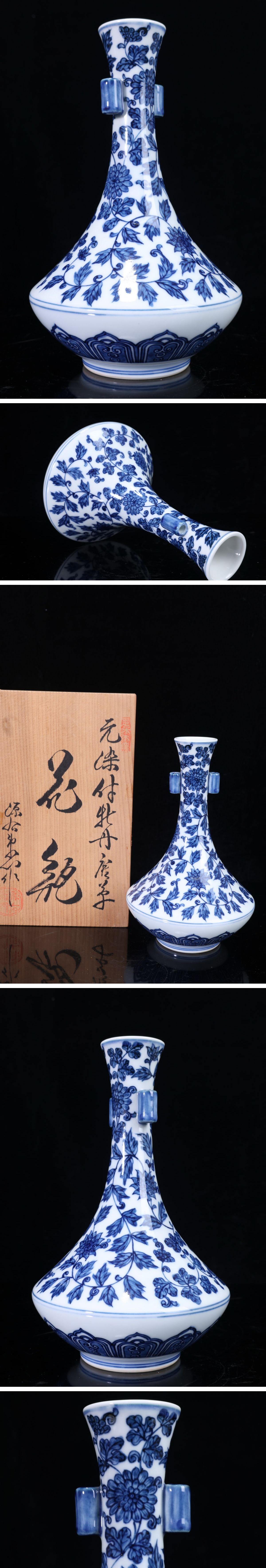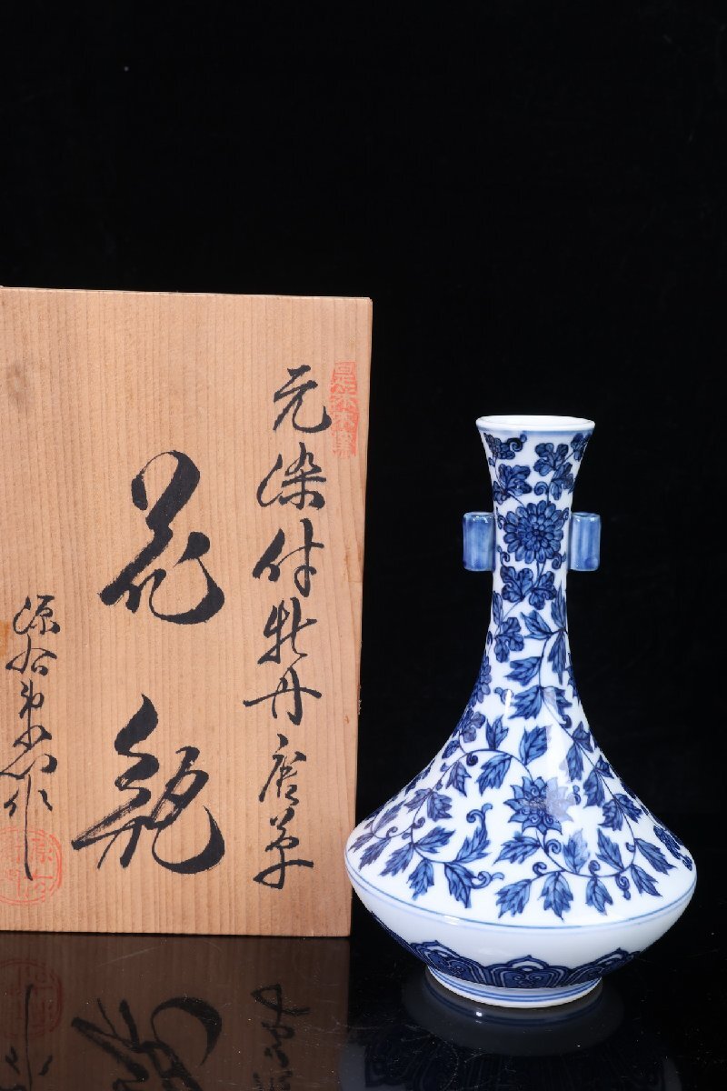 - 【珍品堂】1円から V90-V3 有田焼 館林源右衛門窯 染付 牡丹 唐草紋 細密絵付 花瓶 高19㎝ 共箱 木箱 古美術 飾壺 花器 時代物 骨董品