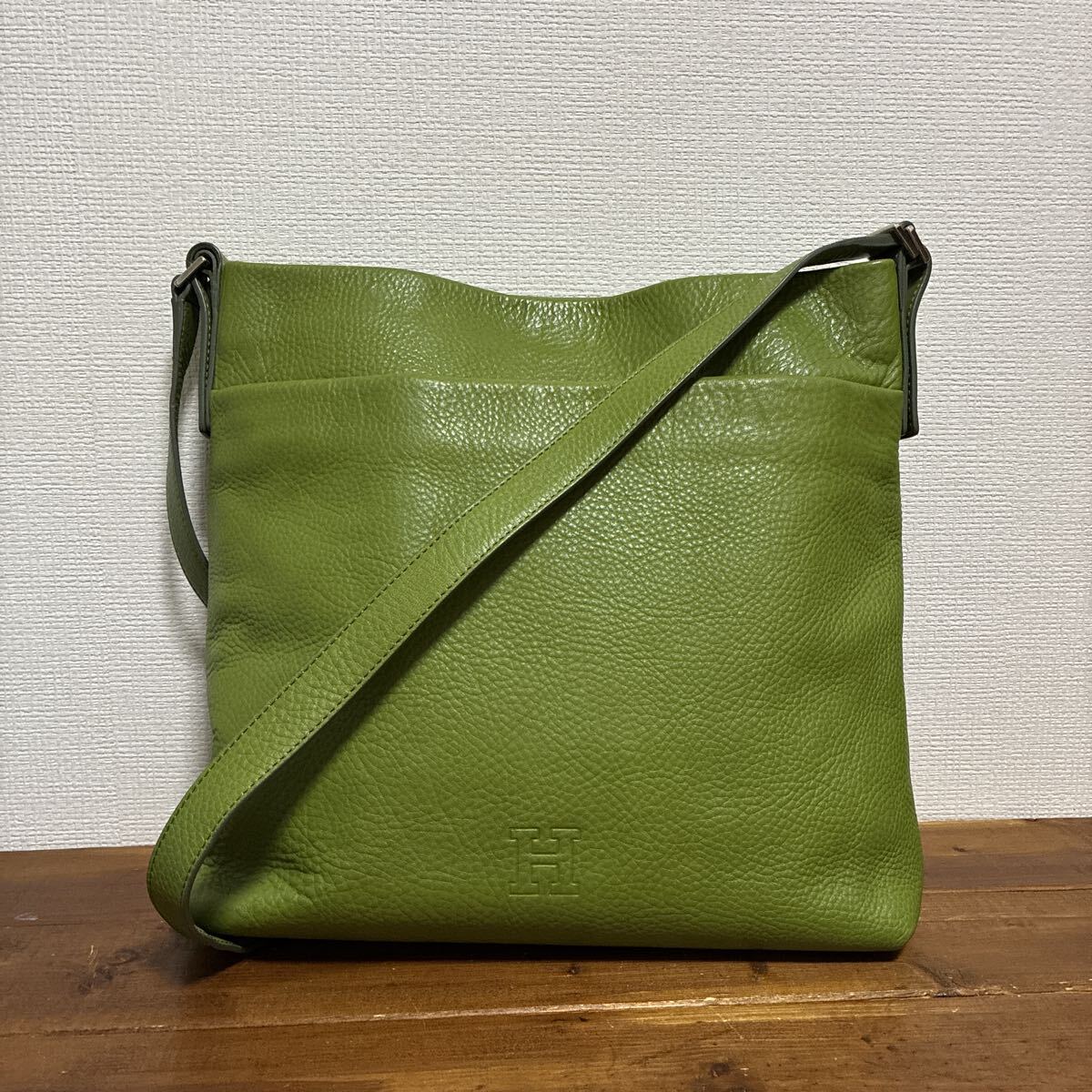 - 【美品】HIROFU 斜め掛け可 A4収納 ヒロフ レザー 本革 グリーン