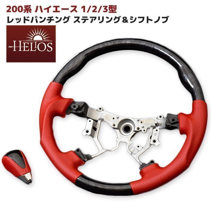 > HELIOS 200系 ハイエース 1型 2型 3型 レッド パンチング PVCレザー 黒木目 ガングリップ ステアリング & シフトノブ 内装 カスタムパーツ