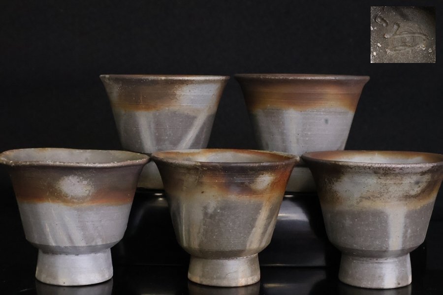 > TB526青備前 煎茶碗 5客◇陶印有/備前焼/煎茶器/煎茶道具/茶盃/茶杯/陶器/焼物/伝統工芸/時代/骨董/古美術/古道具タグボート