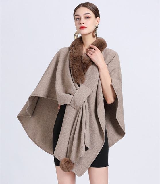 > ニットポンチョ エコファー付き ストール マフラー ケープ レディース ふわふわ ポンポン フェイクファー アウター 毛皮コート カーキ