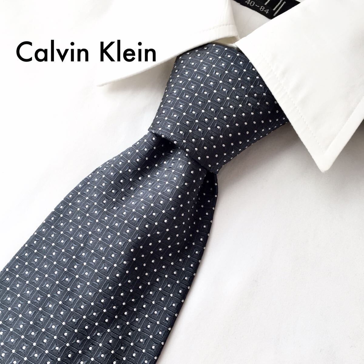 > 美品 Calvin Klein カルバンクライン シルク ネクタイ 絹 日本製 ビジネス フォーマル カジュアル ドット柄 ダークグレー ブランドネクタイ